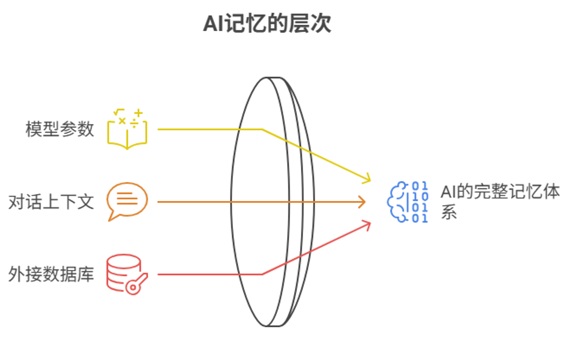 引言:在人工智能的交互中,记忆是让对话连贯、个性化并具备深度的关键。但AI的记忆并非单一形式,而是分为不同的层次和机制。通常,我们可以将AI的记忆分为三类:模型参数里的长期知识、对话长上下文里的短期记忆,以及外接数据库里的可持久记忆。这三种记忆各司其职,共同构成了AI的完整记忆体系。