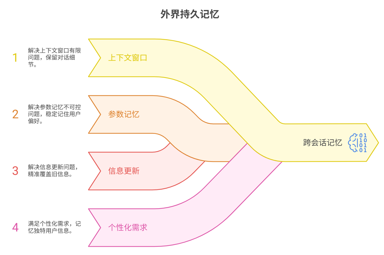 外部记忆系统将需要记住的信息抽取出来长期保存,并在需要的时候精准取回。这样,AI就可以拥有跨会话、可更新、可管理的记忆。