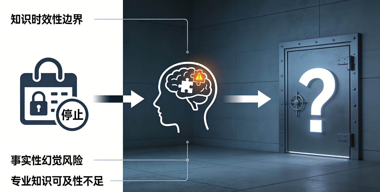 - 知识时效性边界:模型的知识截止于训练数据的时间点,无法自动获取后续信息。