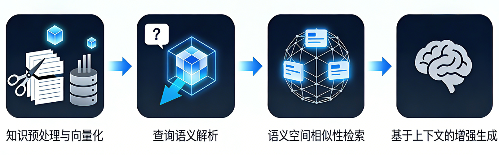 - 知识预处理与向量化:原始文档被分割为语义完整的文本单元,通过嵌入模型转换为高维向量。这些向量代表了文本的语义特征,并存储于专门的向量数据库中,构建出机器可理解的语义索引系统。
