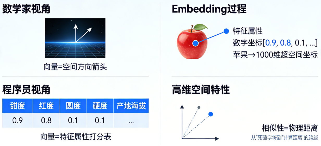 想象一下,如果我们用一千个维度去描述一个苹果,其中包括:甜度、红度、圆度、硬度、产地海拔……每一个特征都有一个从 0 到 1 的数字分值。最终,这个苹果就不再是一个单词,而是一串复杂的数字坐标(比如 $[0.9, 0.8, 0.1, ...]$),被投射在一个一千维的超空间里。