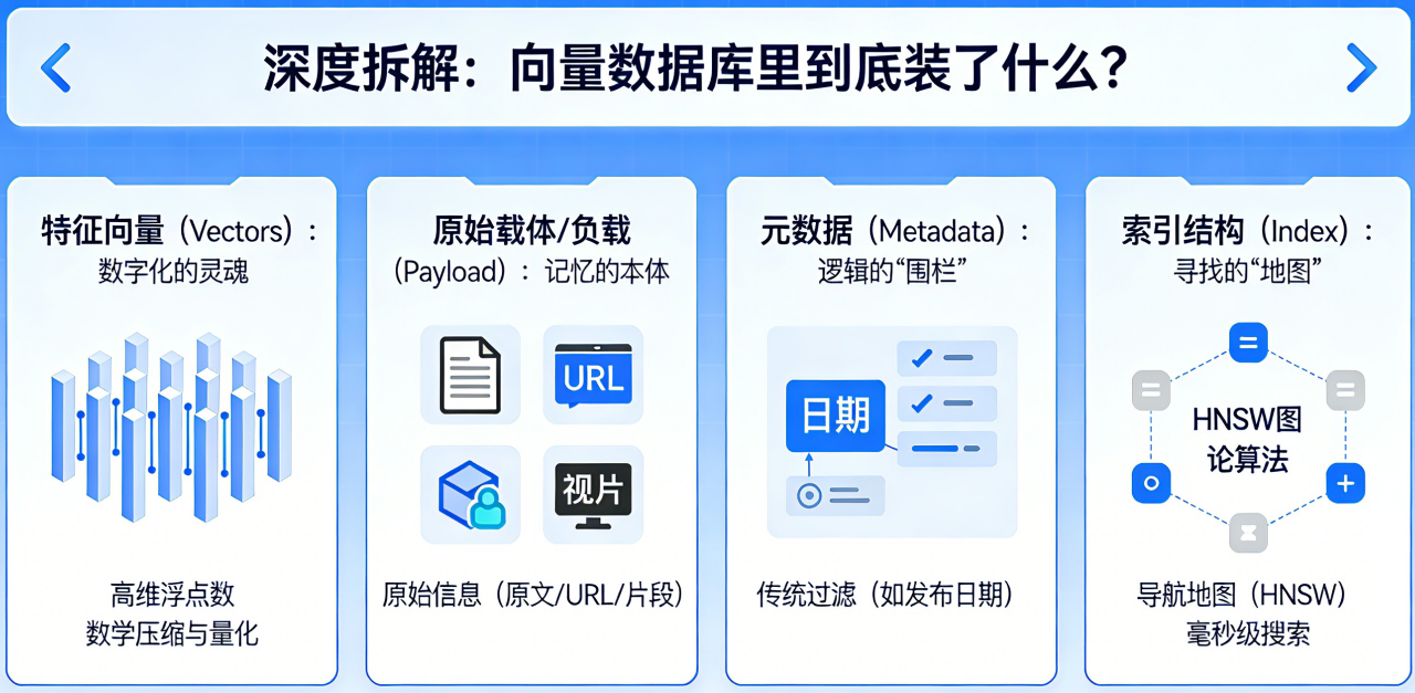 既然要把这种“理解”存起来,我们需要一个比 Excel 复杂得多的容器。一个成熟的向量数据库,其核心由以下四个维度构成: