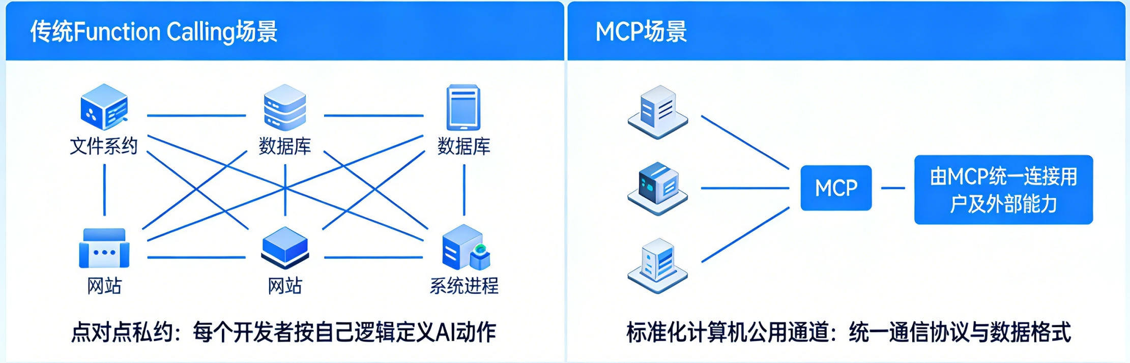传统的 Function Calling 实际上是一种“点对点私约”,每个开发者都按自己的逻辑定义 AI 动作。这种方式在简单场景中有效,可一旦你的智能体需要同时处理文件系统、数据库、网站与系统进程,系统复杂度便呈指数级上升。