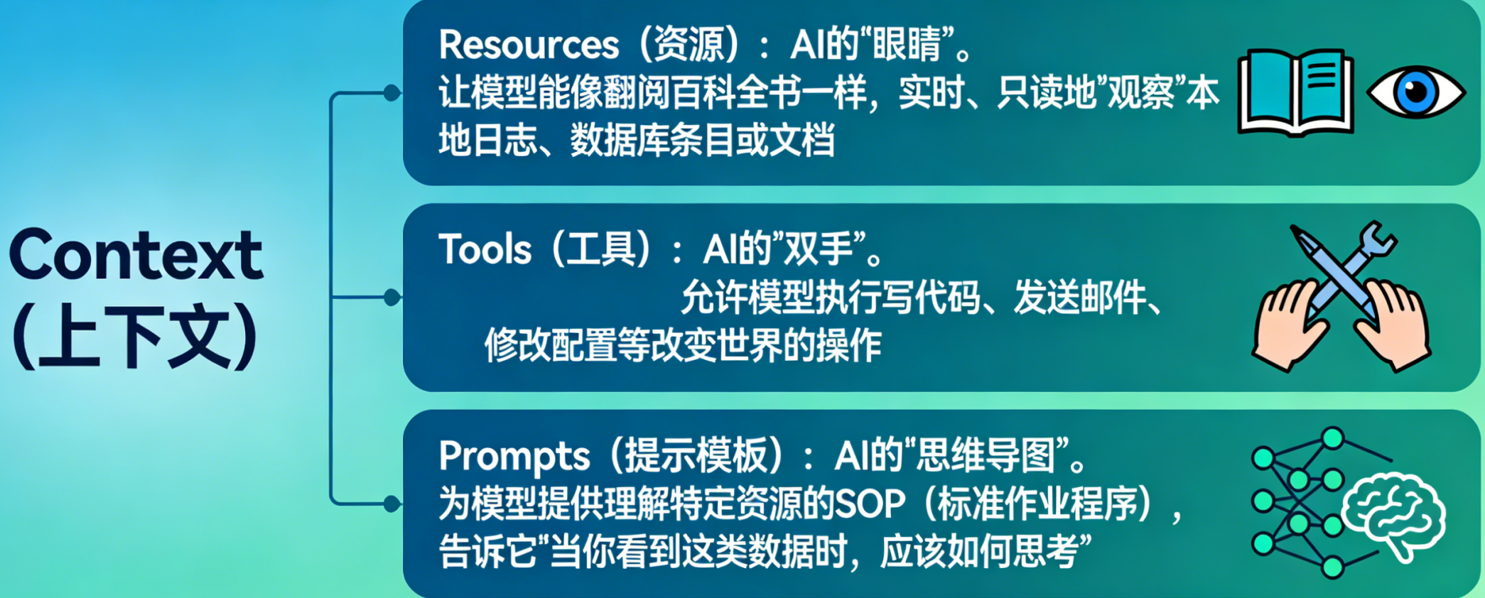 许多人误以为 MCP 只是 Function Calling 的升级版,其实它的命名直指核心:Context(上下文)。该协议系统性地定义了三个维度,构建了 AI 的立体感官: